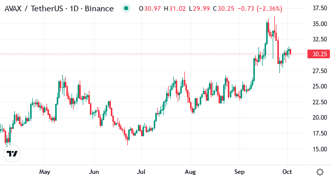 Avalanche (AVAX) is showing an upward trend within its current price range of mid-$20s to mid-$30s. Recent data reveals an impressive one-month price hike of over 23%, complemented by a longer-term growth of around 70% in the past six months. The current RSI, a low 43.6, hints that AVAX isn't overbought, suggesting room for growth. If momentum continues, breaking past $40 resistance is key, with potential to climb toward the upper $40s. While short-term support lies at $22, the 10-day and 100-day moving averages are nearly identical, hovering around $30, marking stability and potential for upward movement. AVAX may soon approach a bullish run if resistance levels are surpassed.