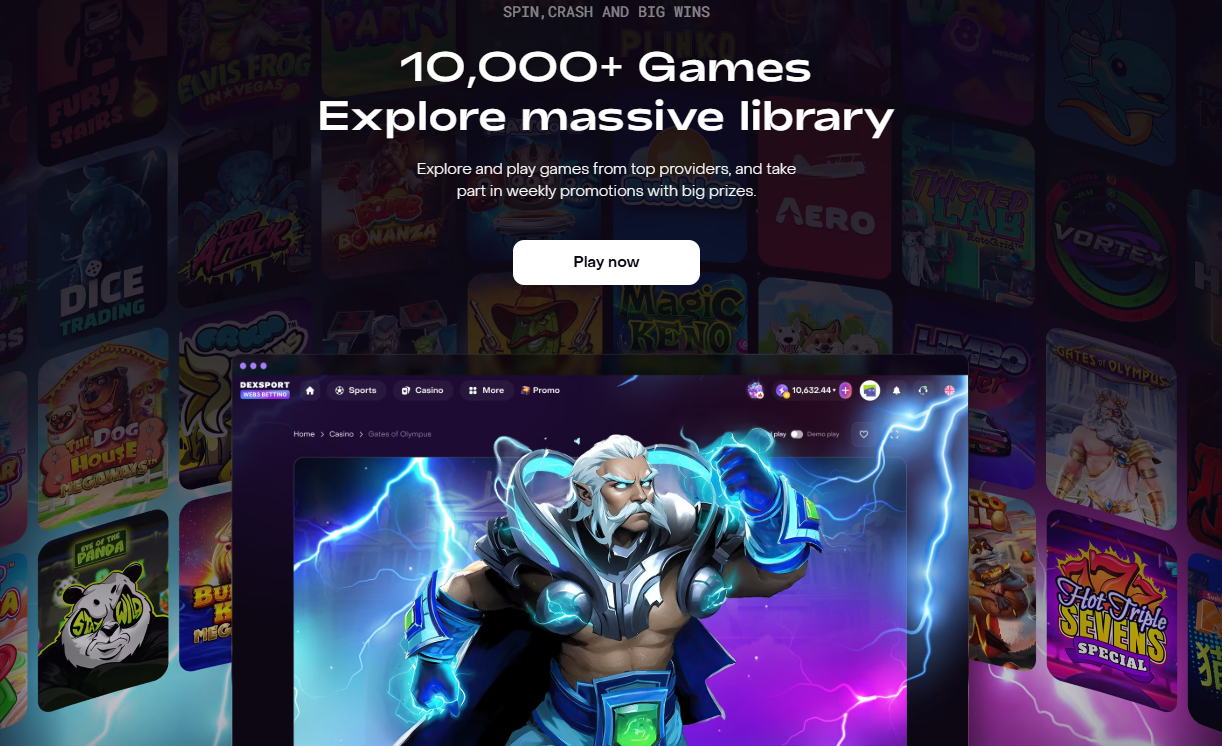 If variety matters to you, Dexsport is hard to beat. Its 10,000+ games cover everything from high-volatility slots to classic blackjack and immersive live-dealer tables. Major studios like Pragmatic Play, Evolution Gaming, NetEnt, Play’n GO, and PGSoft fill out the lineup.