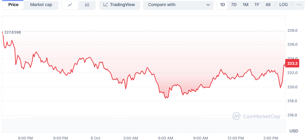 The move pushed SOL under its 30-day SMA ($225.57), with the MACD histogram turning negative at –0.489, confirming a shift in momentum. Meanwhile, the RSI (49.79) shows neutral-to-bearish sentiment, lacking the strength typically needed for a sustained rebound.