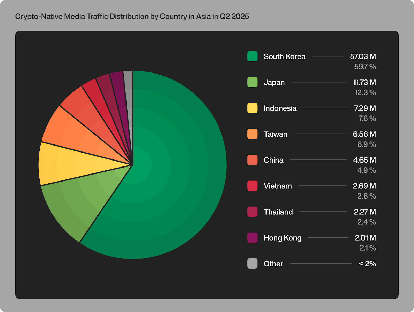 Outset PR’s analytical team, led by Senior Media Analyst Maximilian Fondé, studied Similarweb data from 170+ crypto outlets across ten Asian countries. The results revealed that South Korea accounted for about 60% of total crypto-media traffic in the region — roughly 57 million visits. Japan followed with 12% (11.7 million visits).