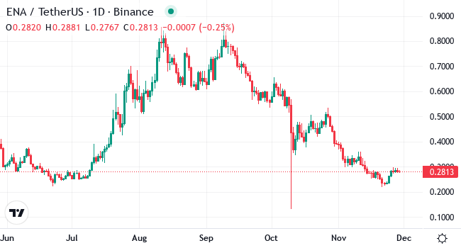 Ethena (ENA) sees a price between 21 and 28 cents, showing some recovery after earlier dips, with a jump of about 19% over the past week. Despite a nearly 36% loss in the past month, traders are hopeful as the price nears a resistance level at 31 cents. Stability around the 28-cent average over 10 and 100 days hints at potential growth. If it breaks through the first resistance, it might aim for a notable 38-cent target. This move could mark a significant climb of around 36% from current levels, signaling a strong bounce-back potential for Ethena in the upcoming weeks.