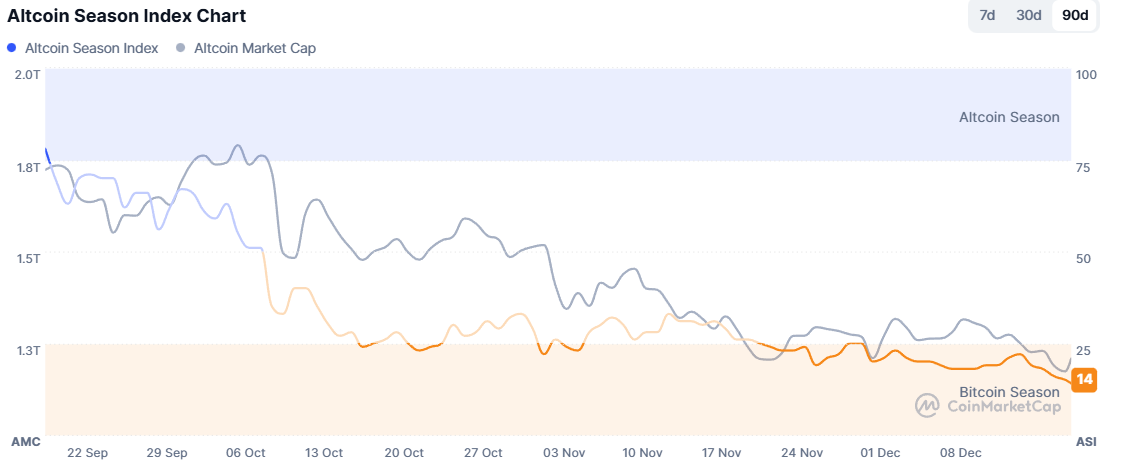 The crypto market is showing a growing divergence between Bitcoin and the broader altcoin complex. The Altcoin Season Index has fallen to 14, marking its lowest reading in the past three months and underscoring a clear rotation back into Bitcoin.