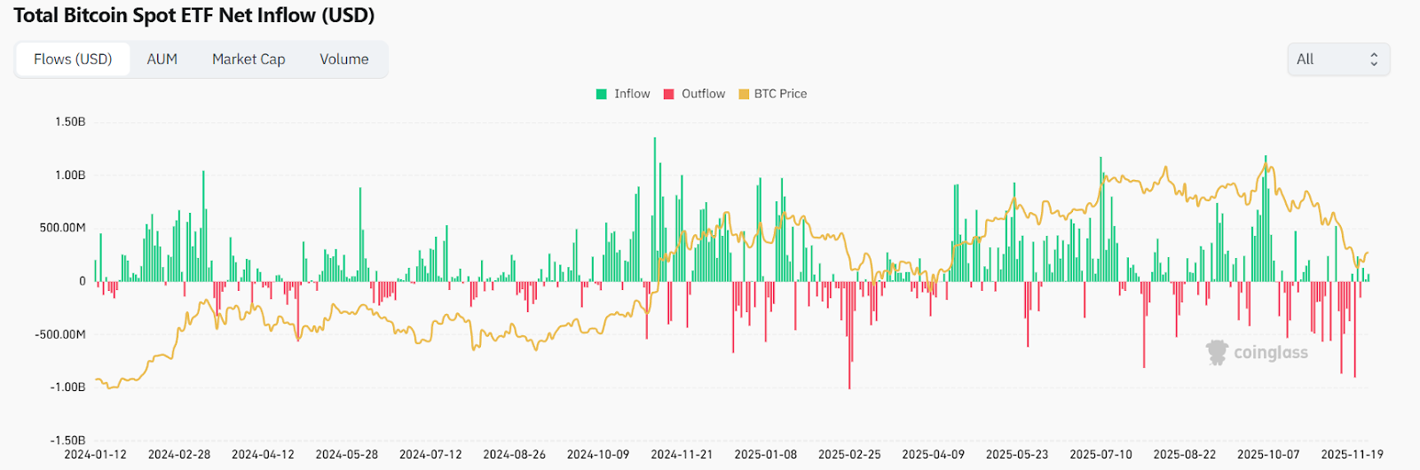 The correction was further compounded by weakness in institutional flows. U.S. spot Bitcoin ETFs recorded $151 million in net outflows on November 24, 2025. It signals reduced institutional demand, which tends to influence broader market psychology.