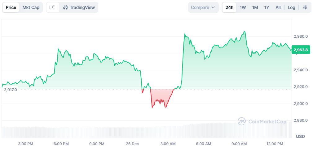 ETH closed above its 7-day simple moving average at $2,968, signaling that buyers are defending recent gains. This level has acted as near-term trend support, helping stabilize price action after the latest pullback.