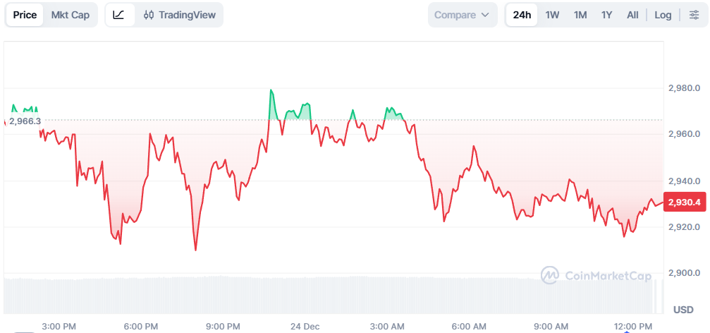ETH fell roughly 1% to $2,920 over the past day, extending its consolidation below the psychological $3,000 level. The move aligns with subdued market activity as investors await the U.S. jobless claims report, scheduled for December 24, which may shape expectations around interest rate policy and liquidity conditions.
