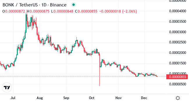 Bonk's price currently hovers between eight to nine thousandths of a cent. Recent movements show it flirting with resistance slightly above its range, around a tenth of a cent. Support holds firm just below eight thousandths. If Bonk breaches its next resistance level nearing one cent, it could jump by about 31%. However, if it slips to the next support level, it might dip by roughly 22%. The ten-day average sits slightly above the current price, while the hundred-day is even higher, suggesting moderate upside potential if the trend turns bullish. All eyes are on whether it will break higher or slip lower in the coming days.