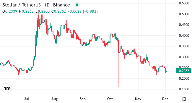 Stellar (XLM) is currently trading within a range of 23 to 26 cents. The coin has faced a tough month, dropping nearly 23%. In the past week, it also slipped by nearly 8%. However, it hovers close to its support level of 23 cents. If momentum picks up, it could break through resistance at 27 cents. From roughly 23 cents, this would mean a 17% rise. Another push might even see it approach 29 cents, adding around 26% from its lower range. While the path shows potential for gains, recent trends highlight a challenging environment. Stellar's indicators hint at possible movement but a cautious approach might be wise.