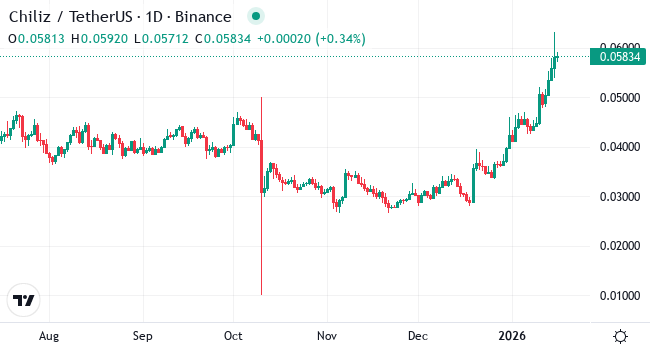 Over the last 30 days, CHZ has climbed from the low $0.03 range to around $0.058, marking one of its strongest monthly performances in recent years. Momentum has remained steady rather than explosive, suggesting accumulation rather than a short-lived spike.