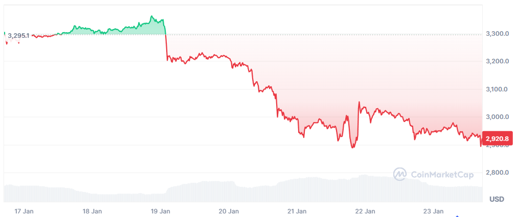 Despite the impressive surge in active addresses, Ethereum’s price remains under pressure. ETH fell around 1% in the past 24 hours, extending a much more significant 11% weekly decline.
