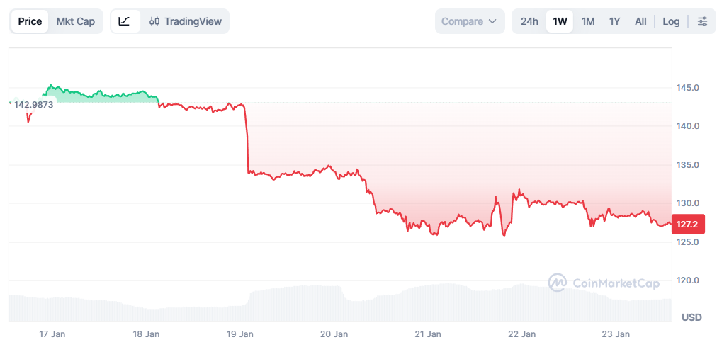At $127.40, Solana currently sits below its 7-day Simple Moving Average (SMA) at $134.76, a level that has repeatedly acted as dynamic resistance.