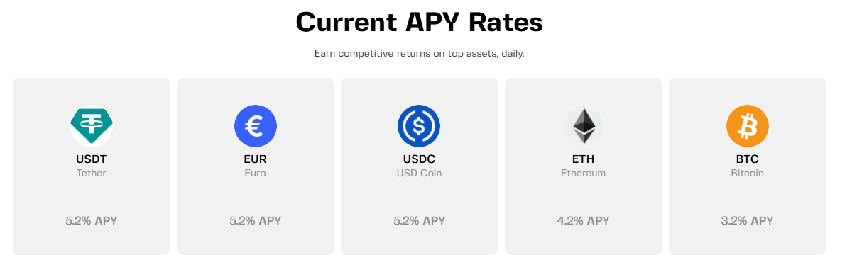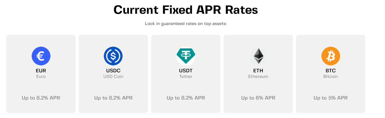 Terms range from one to twelve months. Longer durations offer higher APRs, with EUR, USDC, and USDT reaching up to 8,2% APR, ETH up to 6% APR, and BTC up to 5% APR. For users who prefer consistent income or long-term planning, the stability of fixed rates can be more appealing than variable APYs.