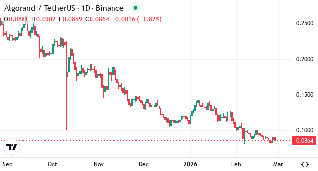 Algorand (ALGO) has seen some ups and downs lately, hovering between about eight and nine cents. It's currently struggling below ten cents, which is its nearest resistance point. If it breaks past this, it might aim for around eleven cents, a roughly 20% increase from its current range. But it hasn't been an easy ride; the past month has seen a drop of over 29%. Looking back six months, the decrease is even sharper, at around 63%. Despite this, Algorand's price could bounce back somewhat if market conditions improve, especially if it rises past its key resistance levels. Keep an eye on it, as it's in a volatile position but has room to grow.