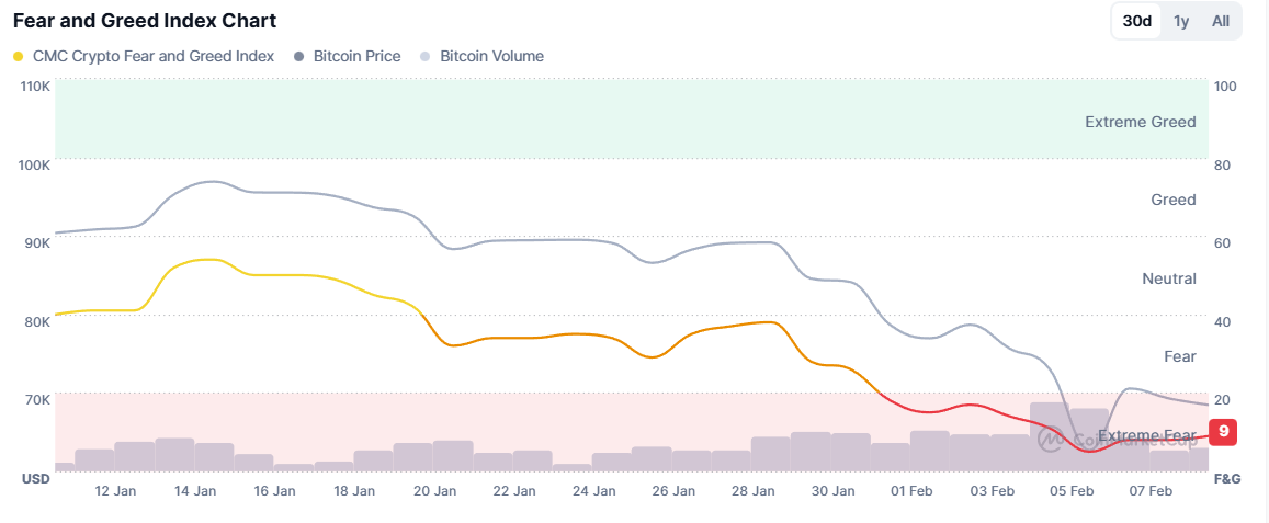 The crypto Fear & Greed Index has dropped to 9, signaling Extreme Fear. In this environment, capital typically retreats from higher-beta assets such as Solana, amplifying downside moves even in the absence of project-specific catalysts.