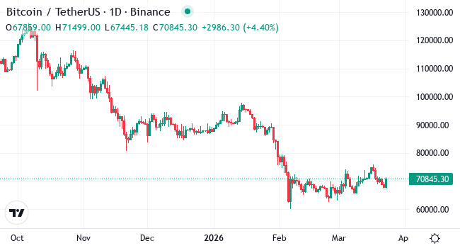 Bitcoin is currently trading between the mid sixty-thousands to the low seventy-thousands. This marks a slight decrease over the past week, though there's been a small gain over the last month. It suggests potential upward movement. The next level to watch is at nearly seventy-nine thousand dollars, which could signal a bullish breakout. If this resistance is overcome, Bitcoin may target around eighty-seven thousand dollars, reflecting a potential rise of over 30% from current levels. The present indicators highlight a relatively strong buying interest, hinting at optimism among traders. However, Bitcoin has experienced a significant dip over the last six months, pointing to the volatile nature of its journey.