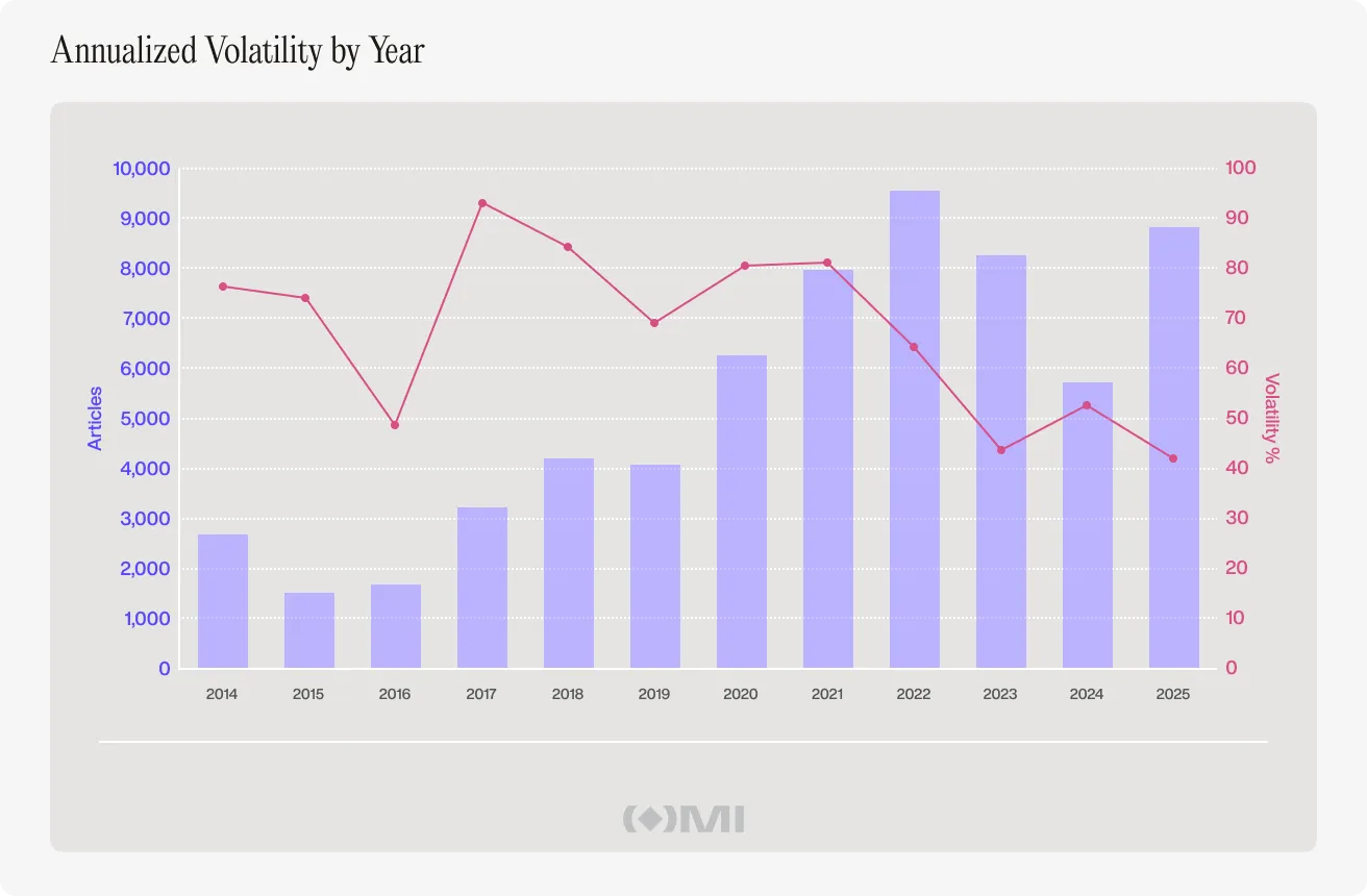 The relationship looks loose even at the yearly level. More articles did not consistently mean more volatility, which only adds to the case that attention is not the same thing as signal.