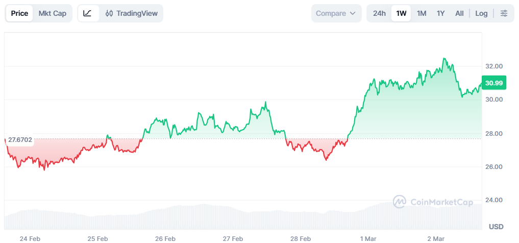 The immediate technical structure hinges on defending $30 support while attempting to challenge resistance near $32–$33.
