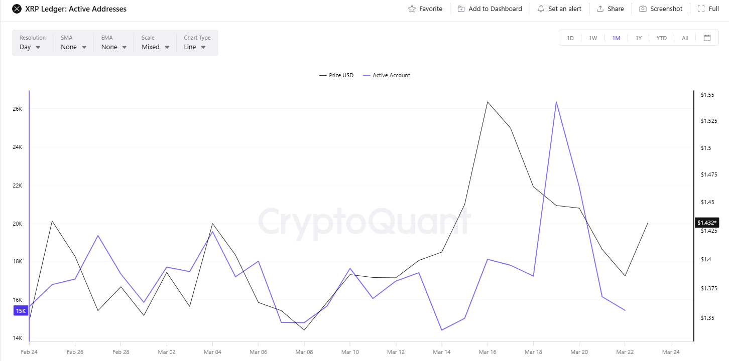 Active addresses on the XRP Ledger dropped by more than 40% between March 19 and March 23, signaling a sharp decline in network engagement.