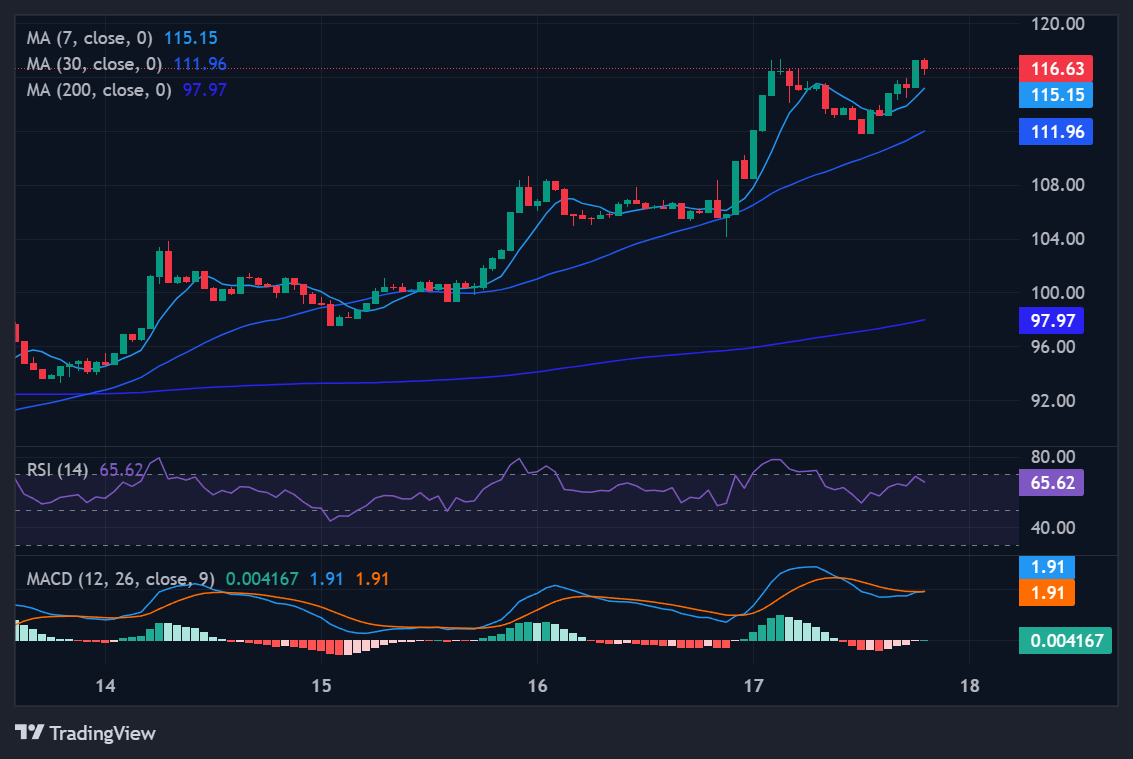 Technically, AAVE is in a "healthy bullish" state. At $116.91, it is trading comfortably above its 7-day ($100.29) and 30-day ($100.93) simple moving averages (SMAs). While its RSI-7 (75.7) indicates short-term exhaustion, the 14-day RSI (63.95) suggests there is still fundamental fuel in the tank before hitting a cycle peak. The primary challenge remains the 200-day SMA at $162.84, which acts as the ultimate gatekeeper for a true bull market.