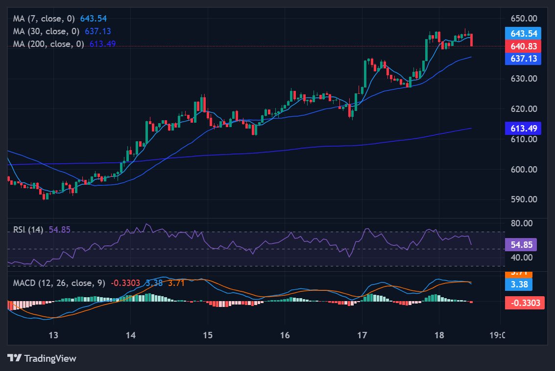 Binance Coin (BNB) is currently acting as the ecosystem's primary "beta" asset. The buzz surrounding the Grayscale GBNB ETF filing and the recent burn of 1.56 million tokens has created a tailwind of scarcity. Technically, BNB is in a strong short-term uptrend, trading well above its 7-day ($618) and 30-day ($616) averages.