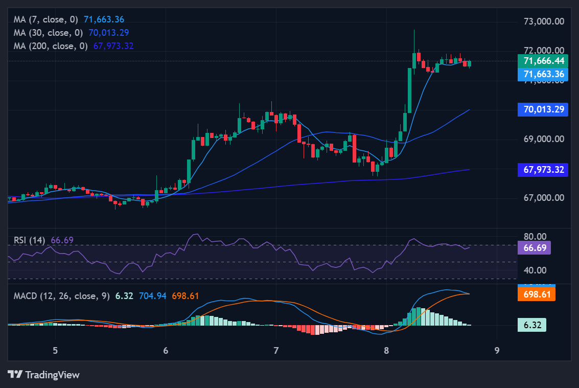 Bitcoin is currently in a solid relief uptrend following ceasefire headlines and a significant short squeeze. Technically, the "King" is trading above its short-term 7-day ($68,424) and 30-day ($69,502) moving averages. However, it remains below the 200-day SMA ($88,919), which continues to tilt downward, suggesting the long-term trend hasn't fully flipped to "moon" status just yet.