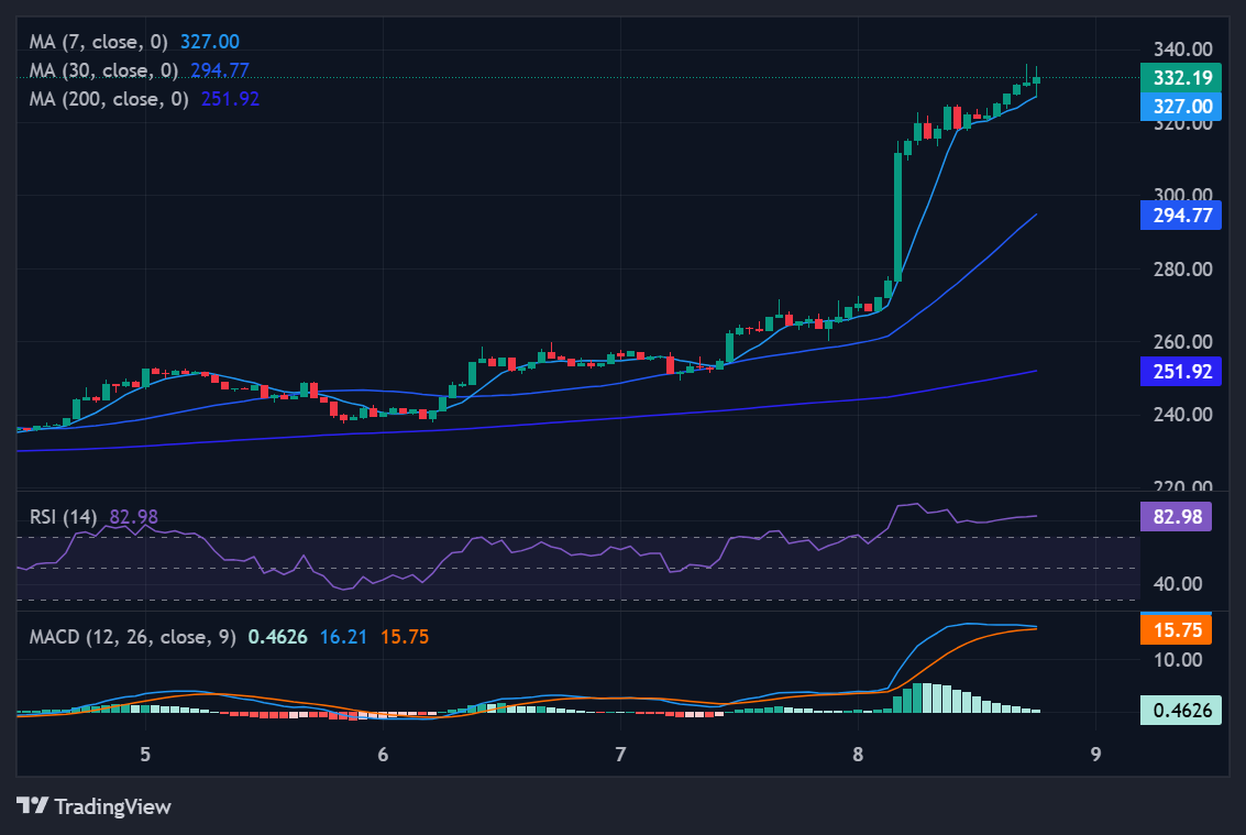 Base Case: Volatile digestion in a wide band from $250 to $440. After a 62% monthly run, pullbacks toward the short-term moving averages are common and often healthy for trend sustainability.