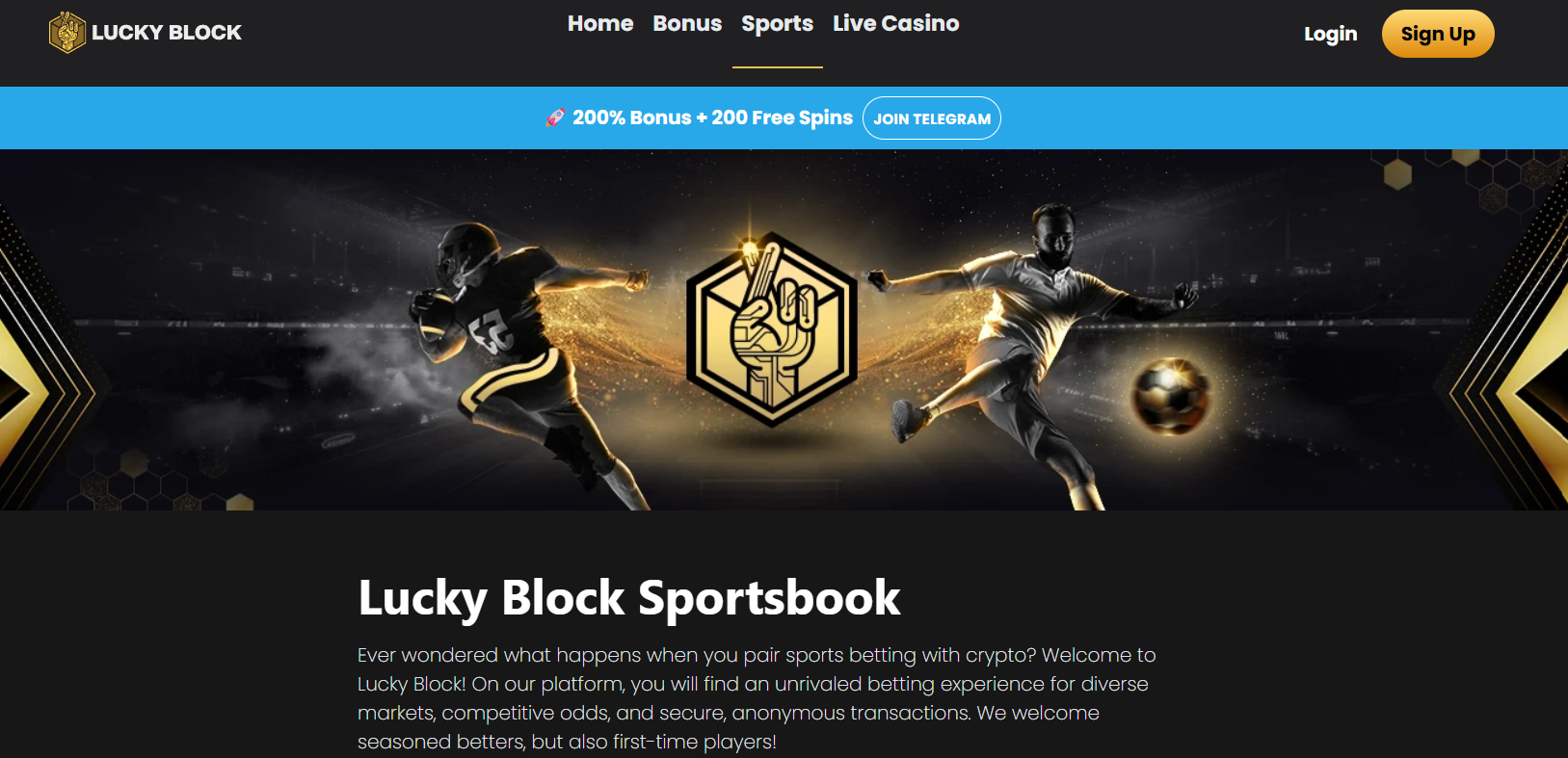 Lucky Block offers wide sports coverage, including 35–50+ sports with live betting and esports integration. Football markets include standard bets and live options, supported by a clean interface.