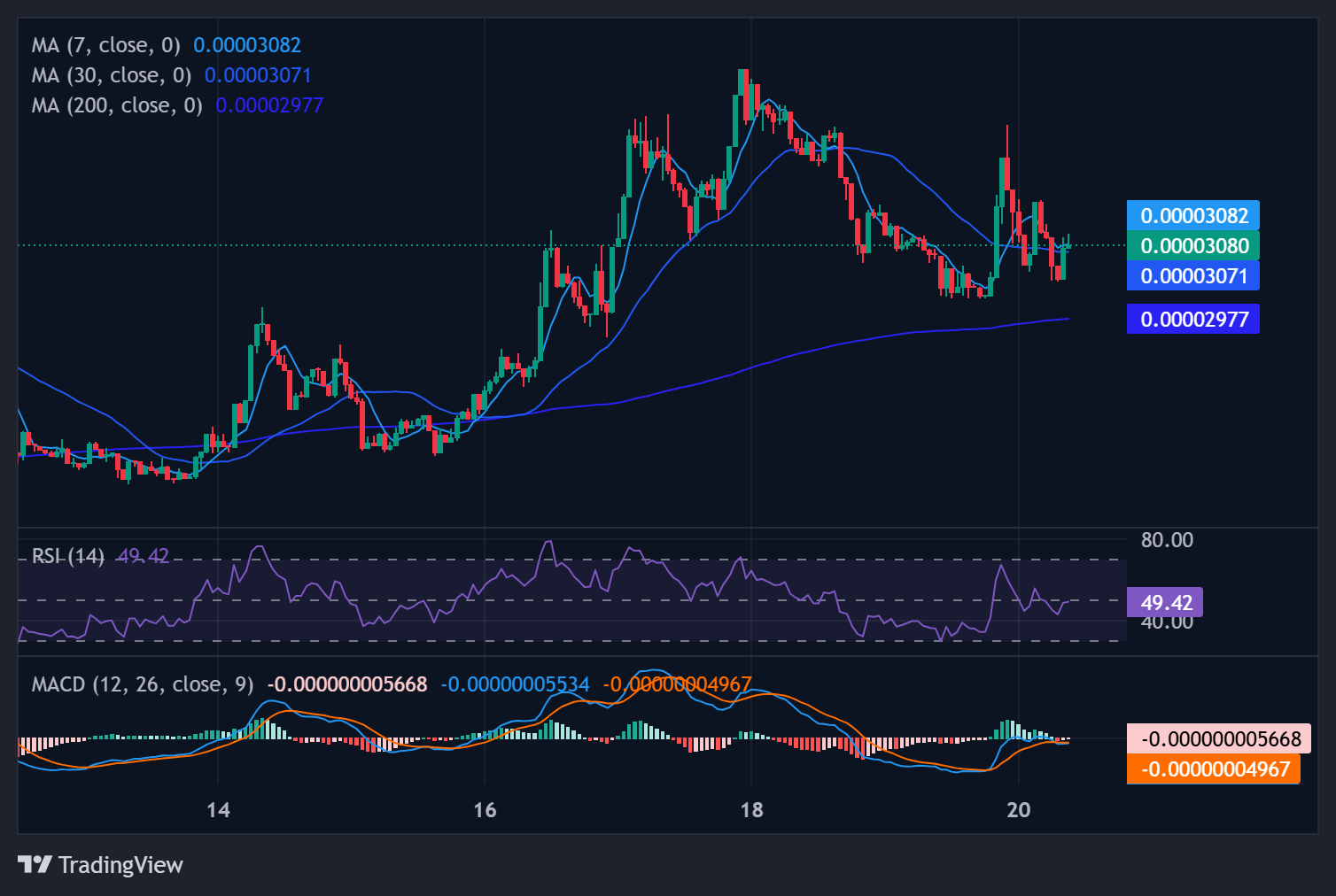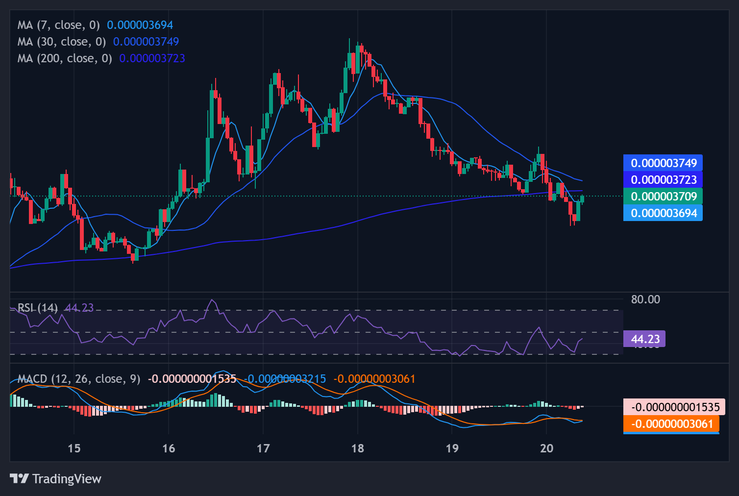 Base Case: Shallow pullbacks toward $0.0000128 followed by a grind toward the 200-day average.