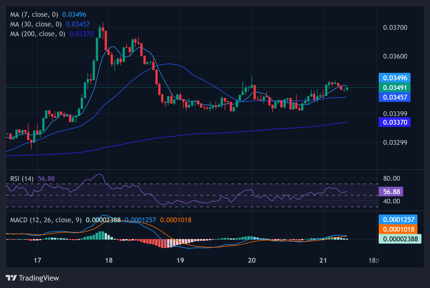 Technical Verdict: The chart shows an early, reasonably healthy uptrend emerging from deeply depressed levels. At $0.0347, KAS is successfully trading above its 7-day ($0.0341) and 30-day ($0.0334) moving averages. The MACD line is clearly positive, suggesting this move has more substance than a simple news-driven spike.