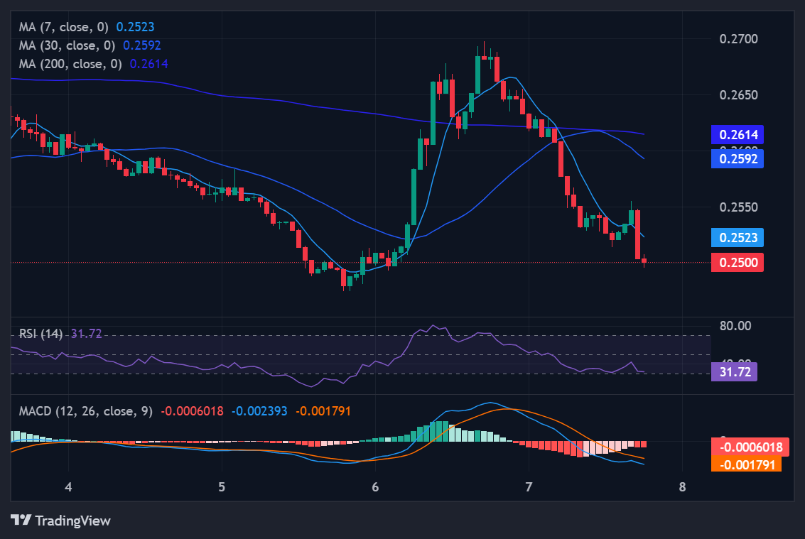 TradingView Tip: Monitor the 7-day and 30-day moving averages (currently both around $0.26). Watch the MACD for a bullish crossover, which would signal that the current "flat" month is coiling for a breakout rather than a weak breakdown.