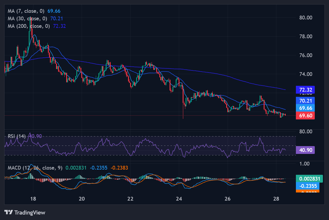 Technical Verdict: QNT is currently in a bearish range. At $69.53, it is trading below its 7, 30, and 200-day moving averages. The MACD histogram (-0.70) is clearly negative, indicating that sell pressure is still dominant. With an RSI-14 at 42.13, it is flirting with the "oversold" territory but hasn't found the buyers needed for a structural reversal.